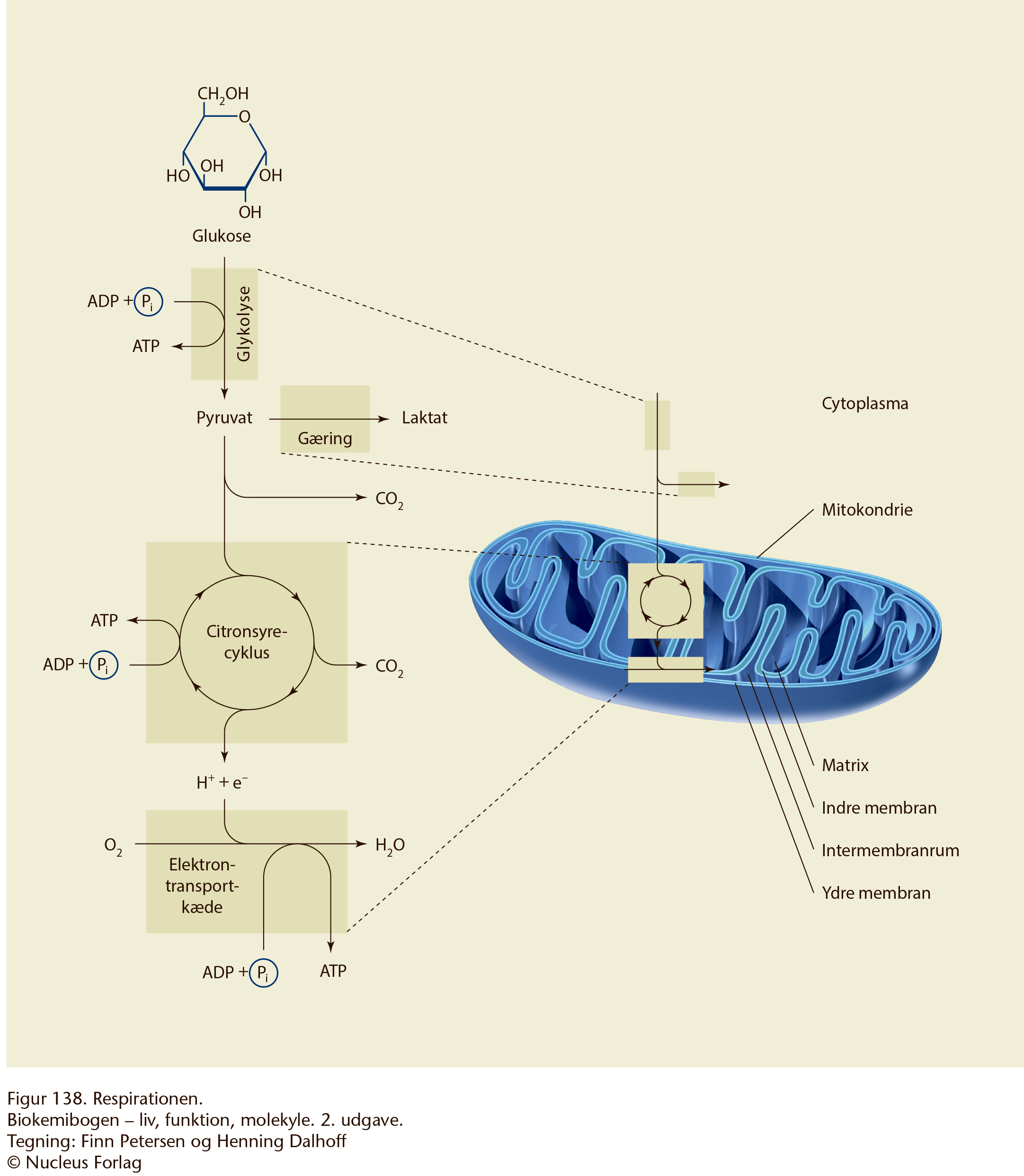Med udgangspunkt i en oversigt der viser processernes placering i cellen, zoomes ind på respirationens og gæringens delprocesser, glykolyse, mælkesyregæring, transport fra cytoplasma til mitokondrie, citronsyrecyklus og elektrontransportkæden.